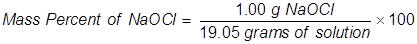 1. Calculate the mass percent of sodium hypochlorite in commercial bleach, if 1.00 grams of NaOCl (the active ingredient in bleach) is dissolved in 19.05 grams of solution.