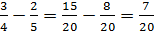 Right now it is difficult to take two-fifths away from three-fourths because the parts are not the same size. So our first job is to rewrite the problem so that both fractions have equal sized pieces.
